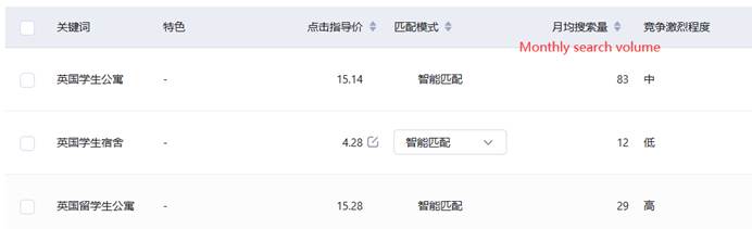 Baidu keyword planner is just a tool. But the key method of exploring target keywords is digging the business. In English-Chinese translation, we often find that there are several variants of Chinese words for one English phrase. For example, student accommodation in UK could be ‘英国学生公寓’, ‘英国学生宿舍’ or ‘英国留学生公寓’. All of the Chinese phrases are correct for this English phrase, but we need to find the most suitable one for the landing page. In this case, comparing monthly search volume of them will help use choose the target keyword.