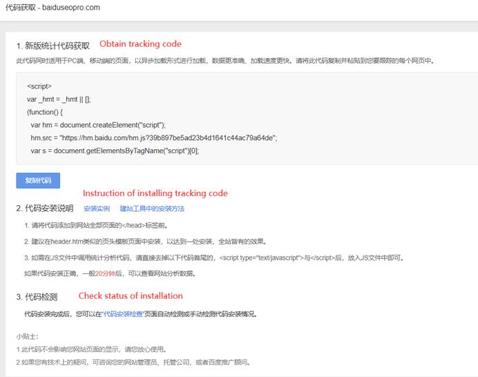 Now, it’s time to obtain the tracking code and install it onto the website. According to the instruction, install the code before </head> tag of all pages on the website.