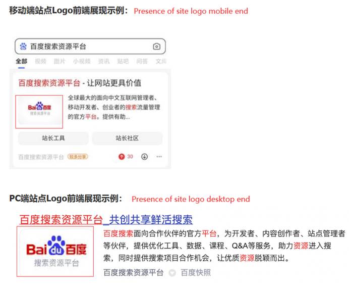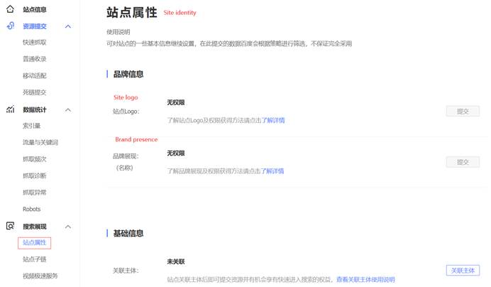 The first sub-module of search presence is the site identity. It contains two parts. Firstly, brand information. In this part, Baidu allows you to submit site logo and brand name. Still, this requires you to have VIP membership.