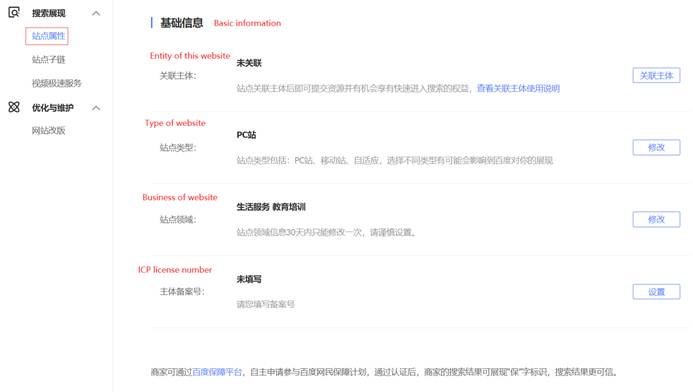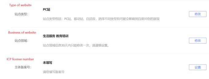 Secondly, type of website. Baidu has three types: PC, mobile and self-adaptive websites. Different choice of type affects presence. Thirdly, business of website. In the verification process of Baidu Webmaster Tools, we have done it. And Baidu allows you to change it if necessary. However, please be careful when changing it. Lastly, ICP license number. This requires you to apply for an ICP license before setting it here.