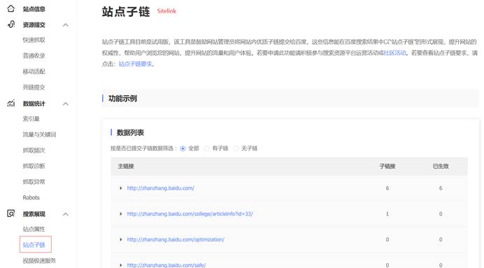 Sitelink sub-module of Baidu Webmaster Tools