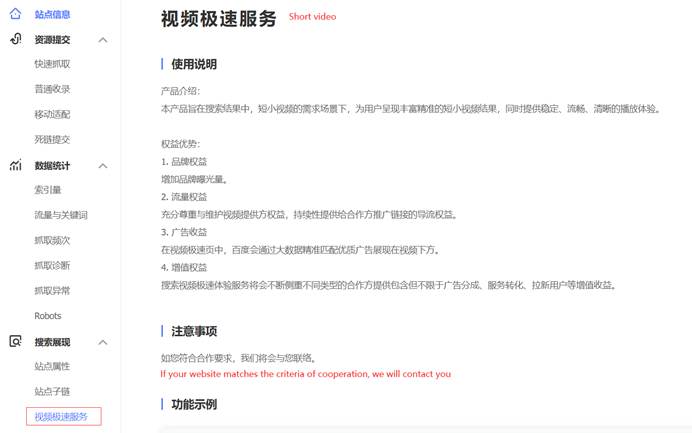 Short video sub-module of Baidu Webmaster Tools