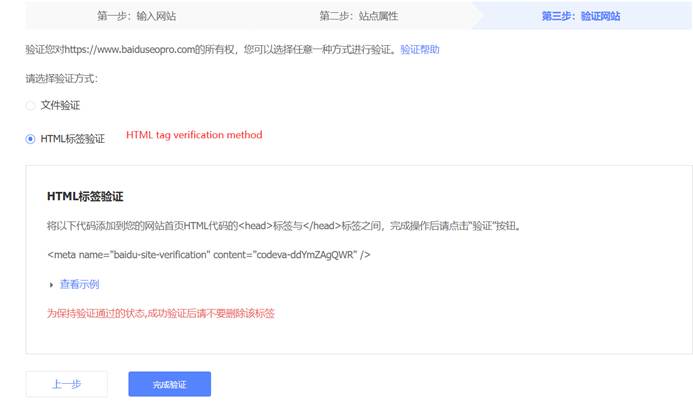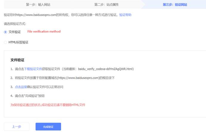 You can either use the file verification method. In this way, just put the file that Baidu provides under the root directory of your website and click verify.